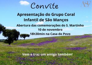 Integrada na abertura das comemorações do S. Martinho, foi feita a Apresentação do Grupo Coral Infantil de São Manços, na Casa do Povo desta vila, pelas 18 horas e 30 minutos. A organização do evento apela à participação de toda a comunidade: “Vem e traz um amigo também!”.